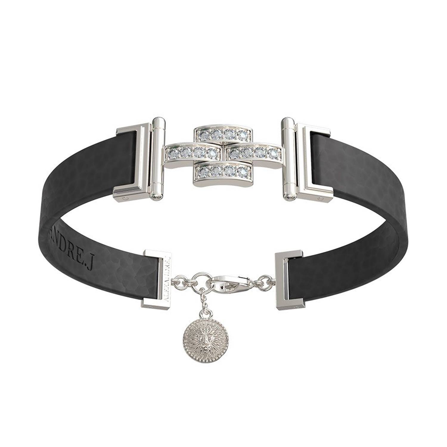 Fuse architectural precision with bold texture in the Frame Cuff Bracelet. This striking piece features a wide matte black strap (likely rubber or silicone, with a subtle hammered texture) anchored by sleek, high-polish silver-tone end caps reminiscent of modern frames. The centerpiece is a powerful horizontal cross motif, formed by three bands of glittering pave-set crystals that catch the light with every movement. Secured by a polished lobster clasp and ...