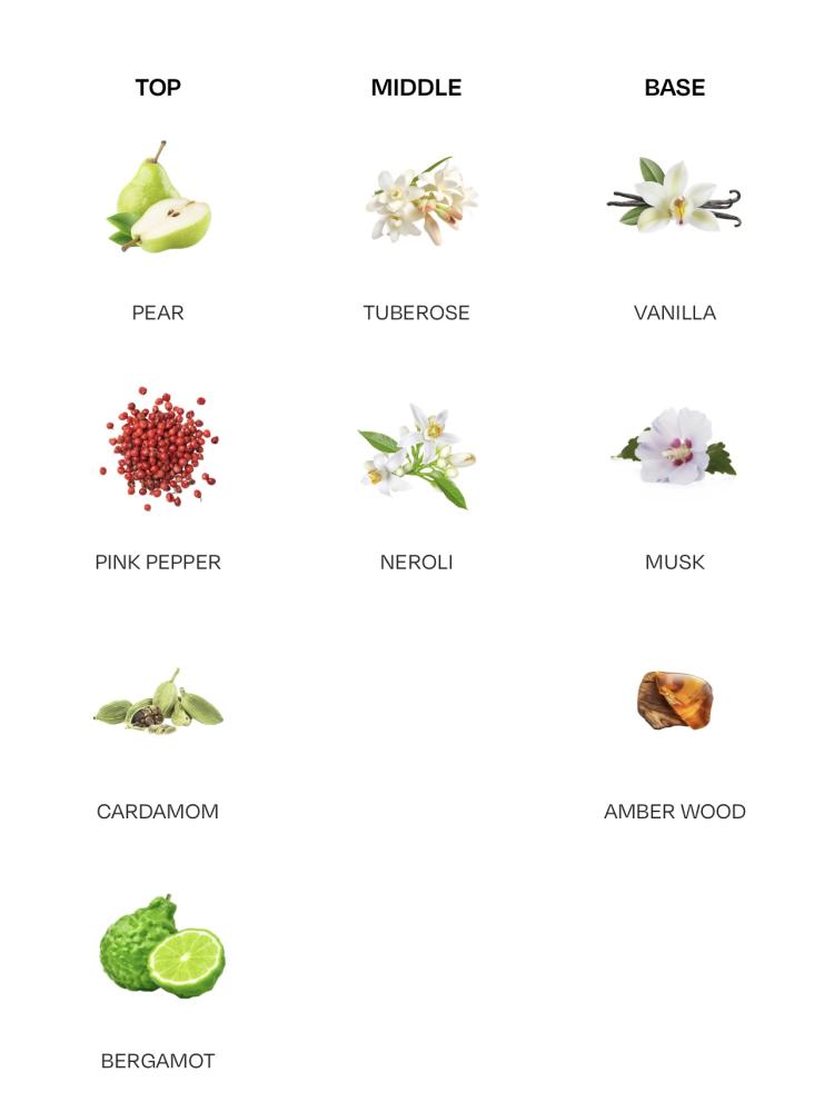 Imagine the delicate sweetness of ripe pears, their juiciness captured in every drop. Paired with the gentle warmth of pink peppercorns, the fragrance takes on a subtle, spicy edge that awakens the senses. These initial notes are just the beginning of a remarkable olfactory expedition. As the fragrance unfolds, the heart reveals itself in the form of tuberose. Known for its heady and enchanting aroma, tuberose adds depth and allure to the composition. It’s as if the scent is undergoing its own transformation, much like the butterfly emerging from its cocoon. This central note symbolizes the blossoming of one’s true self, an elegant evolution of identity.
