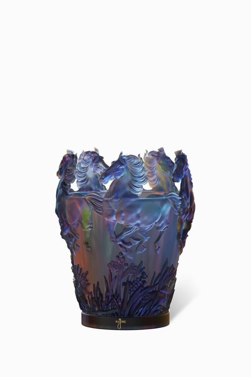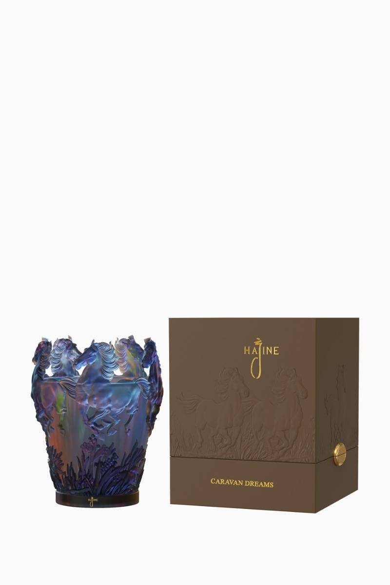 The Caravan Dreams Burner by Hajine is a captivating tribute to Arabian nights, inspired by the shimmering hues of twilight over the desert. Crafted with exceptional artistry, it transforms the incense or bakhoor ritual into a luxurious sensory and visual experience. Design & CraftsmanshipMade from iridescent crystal-like glass, the Caravan Dreams Burner reflects an array of colors that shift with the light—blues, purples, and subtle hints of amber—reminiscent of the ... desert sky at dusk. The design features three-dimensional galloping horses, meticulously sculpted to capture their strength, movement, and symbolic freedom. At the base, intricate floral and grass motifs add depth and natural elegance. Its open-top silhouette allows aromatic smoke to rise gracefully, while the frosted texture and reflective finish create a magical play of light, making it as stunning to behold as it is functional. Packaging ElegancePresented in a matte chocolate-brown box, the packaging mirrors the burner’s design with embossed horse motifs. The brand name Hajine and the product name Caravan Dreams are elegantly printed in gold foil, highlighting its premium stature. Color & Finish Body: Iridescent glass in shifting blue, purple, and amber tones with 3D horse and floral engravings Accents: Fine detailing that catches and refracts light Box: Matte chocolate brown with embossed horse design and gold lettering A Collector’s MasterpieceThe Caravan Dreams Burner is more than a fragrance accessory—it is a statement of artistry and heritage. Perfect for collectors and connoisseurs of luxury, it embodies the romance of desert journeys and the timeless tradition of Arabian craftsmanship. UsageDesigned for burning bakhoor or incense, it allows the fragrance to diffuse beautifully while the sculptural form adds an unmistakable touch of prestige to any setting.