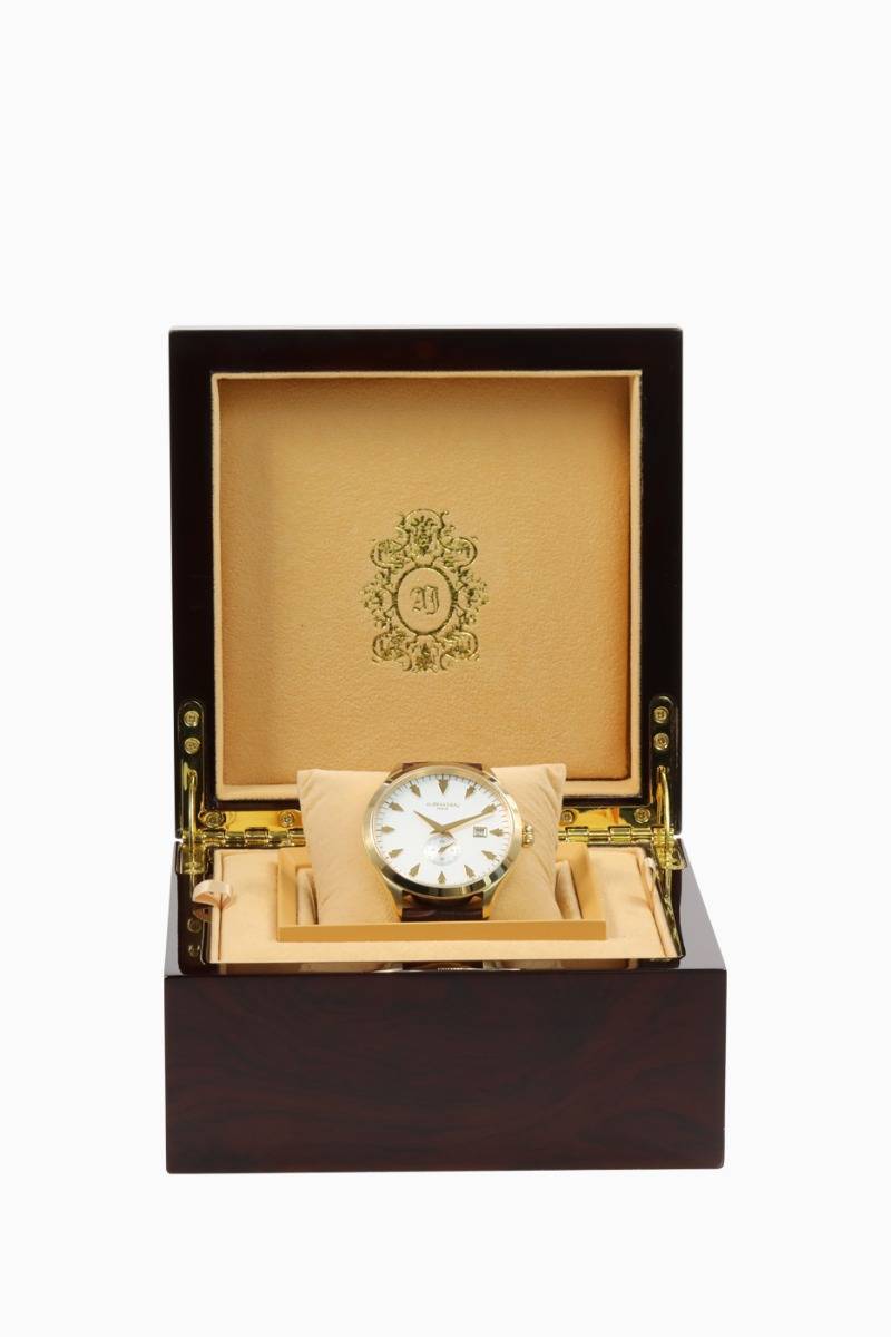 The CLASSICO Gold watch is a safe choice to wear every day. This quartz model has more complex specifications than a mechanical model and a sapphire crystal. The white dial, the golden case and the brown leather strap make this model a beautiful classic object of watchmaking. EAN Code: 370 127 860 0127 Color: Gold Reference: AJ8003QG Material & Finishing: PVD 3N Strap: Leather Lens: Sapphire Glass Mechanism: Quartz RONDA ...