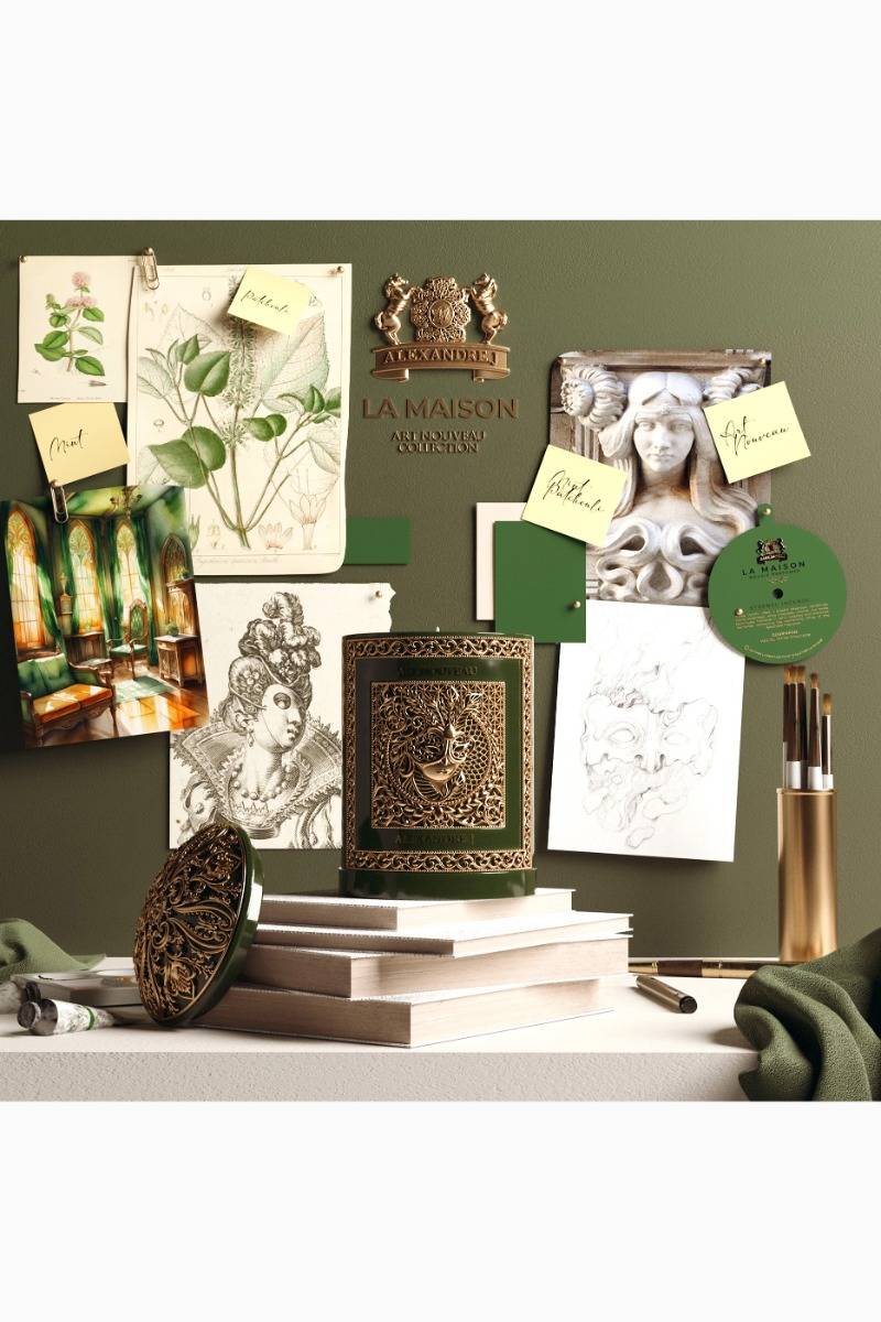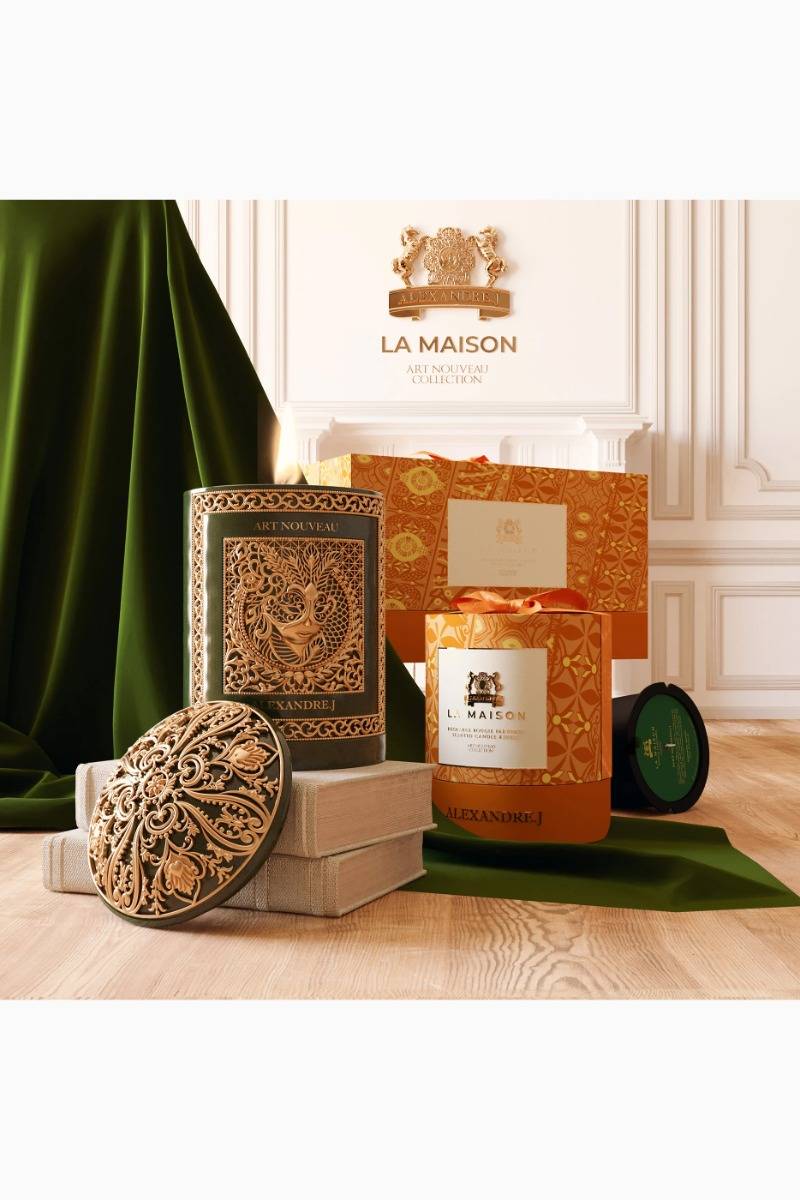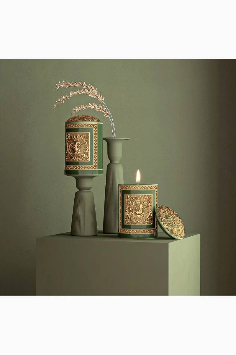 The Deep Emerald Candle and Holder Gift Set features the Mint Patchouli candle, offering an aromatic and vegetal ambiance that evokes lush green landscapes with woody undertones. This luxurious set is not only a fragrance experience but also a true objet d’art, perfect for enhancing any space with its distinctive, nature-inspired scent.