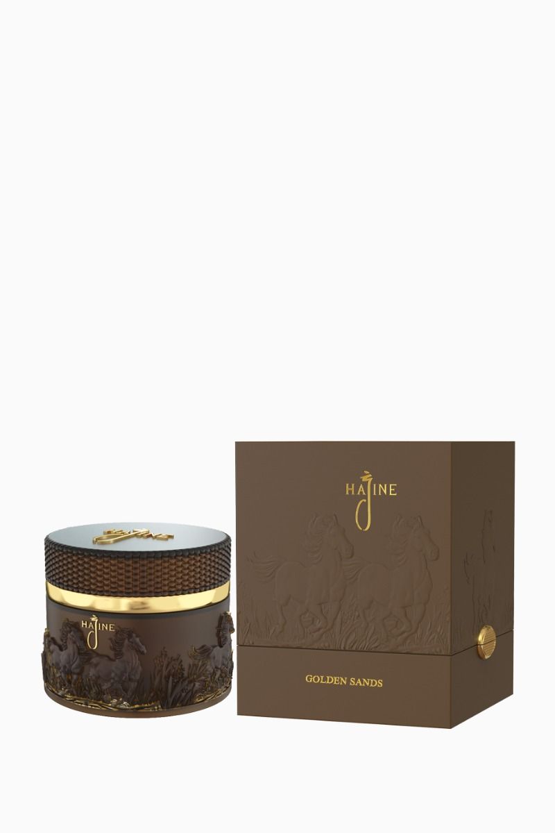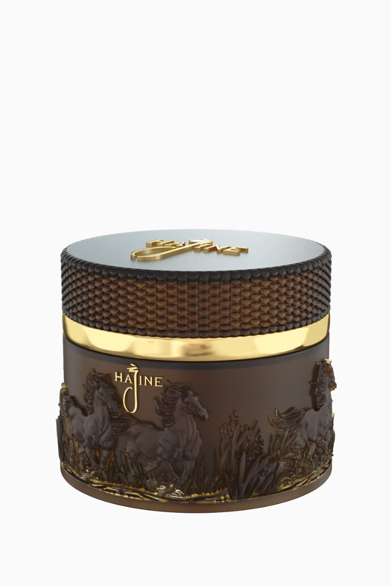 Packaging Elegance Encased in a matte chocolate-brown presentation box, the packaging mirrors the jar’s design with subtle embossed horse motifs for a cohesive visual identity. The brand name Hajine and the product name Golden Sands are stamped in radiant gold foil, a reflection of the premium experience within.