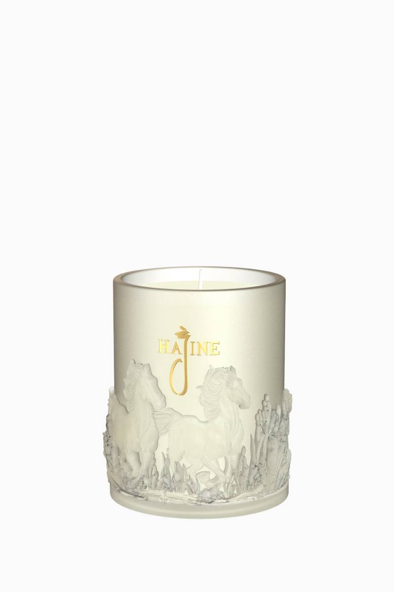 The Ivory Pearl by Hajine is a refined fusion of elegance and ambiance, designed to fill any space with a warm glow and a touch of luxury. Crafted with the same artistry and attention to detail that define the Hajine brand, it is both a decorative piece and a sensory delight. Design & CraftsmanshipHoused in a frosted crystal-like glass holder, the Mini Candle White is adorned with intricately sculpted galloping horses, ... a symbol of strength, grace, and Arabian heritage. The detailed floral and grass motifs at the base enhance its artistic appeal, creating a harmonious design that captivates even when unlit. The frosted glass softly diffuses the candlelight, producing a gentle, ambient glow that transforms the atmosphere. The Hajine logo in elegant gold lettering adds a final touch of prestige to the piece. Packaging ElegancePresented in a matte chocolate-brown box, the packaging mirrors the candle’s equestrian motif with subtle embossed horse designs. The brand name Hajine and product title are stamped in radiant gold foil, reflecting its premium nature. Color & Finish Candle Holder: Frosted white glass with 3D horse and floral engravings Accents: Gold Hajine logo for a luxurious finish Box: Matte chocolate brown with embossed horse design and gold lettering A Collector’s MasterpieceMore than just a candle, the Mini Candle White is a symbol of artistry and sophistication. Perfect for intimate gatherings, home décor, or gifting, it embodies the timeless elegance and heritage of the Hajine brand.