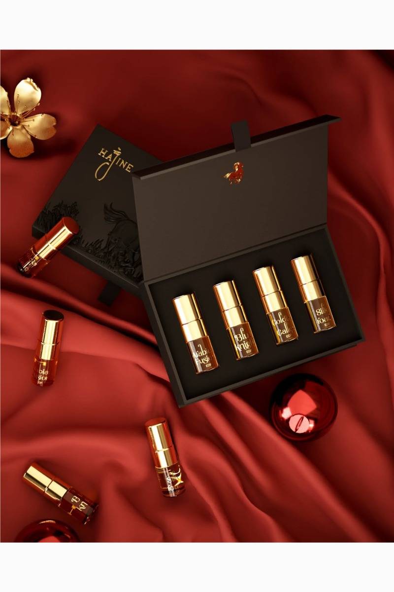 The Discovery Set is your gateway to experiencing all of Hajine’s signature scents. Each 2 ml vial oers a glimpse into a unique fragrance journey. Golden Gallop exudes vibrant elegance, Silk Road unveils exotic mysteries, Arabian Fusion combines opulence and tradition, and Blue Knight radiates bold sophistication. Perfect for sampling or gifting, this set lets you explore the essence of Hajine with ease