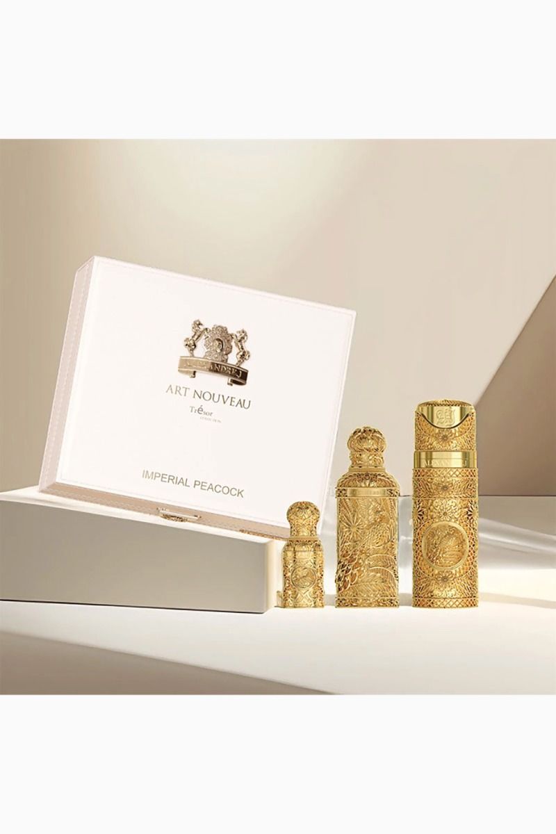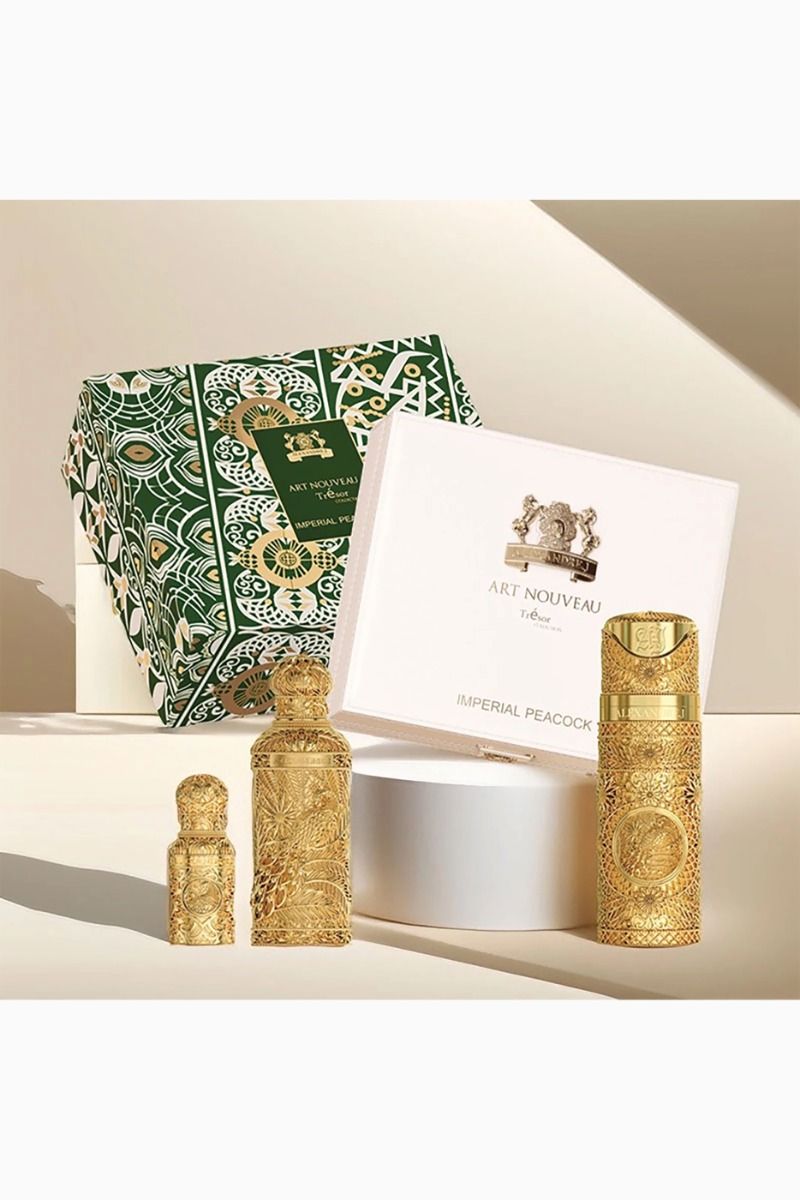The Imperial Peacock Tresor Collection blends timeless Art Nouveau elegance with modern sophistication. It includes an Imperial Peacock perfume, a travel spray, and a body & hair mist. Each piece is housed in golden bottles and presented in a sleek white leather box with gold accents. More than a fragrance, this collection is a celebration of art, scent, and refined luxury.