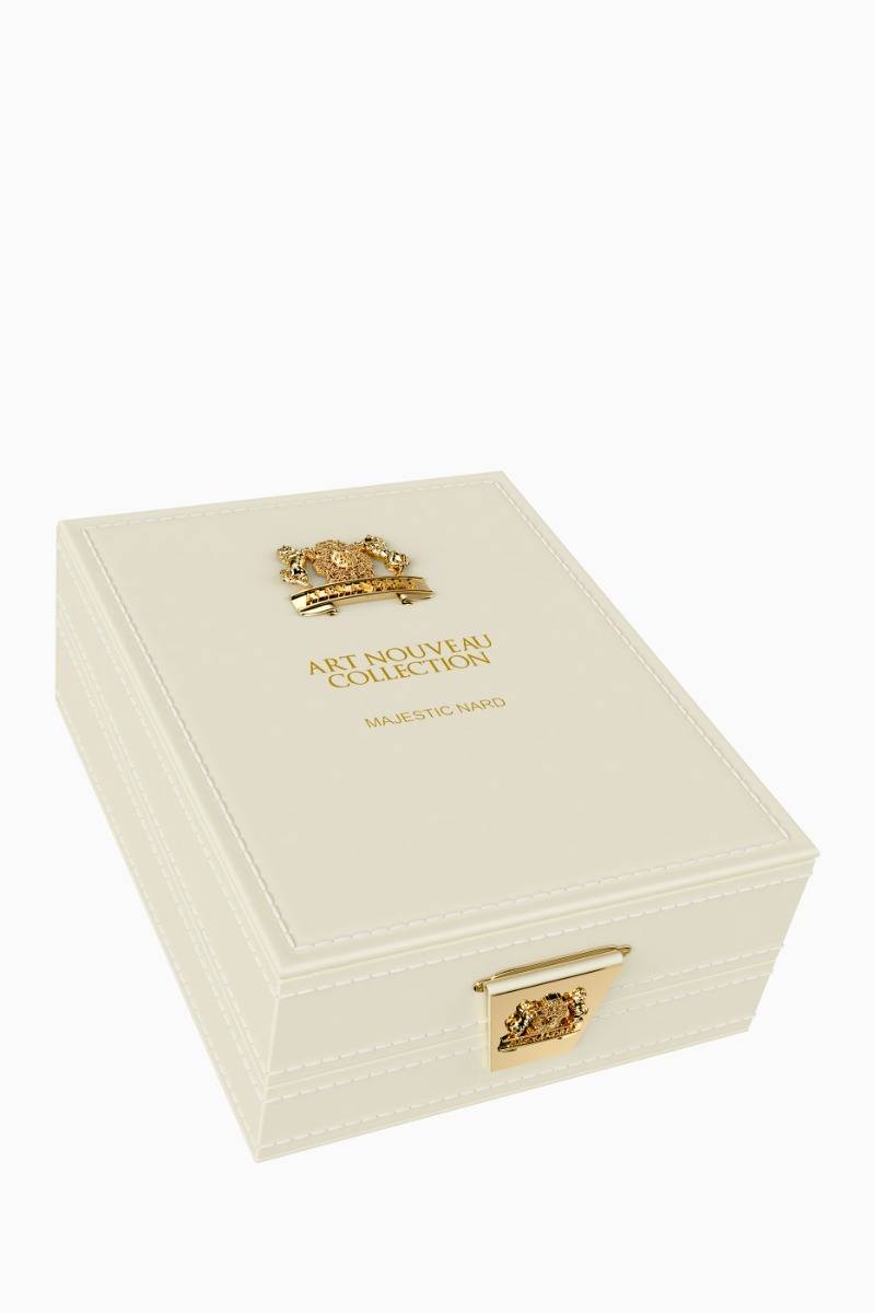 Travel in olfactive evocation inspired by the natural world of art and architecture. The opulent hand-blown bottles are made even more precious featuring patterns gilded with fine gold decadently packaged in lavish silk and leather... a nod to the period’s significant impact on design and decorative art. A seamless display of art’s most powerful symbol, this herald-worthy fragrance is a league of its own. Majestic Nard - fit for a ... king or queen, the opulent scent of undeniable power and ambition. WOODY & SPICY Top notes: Galbanum, Pink Pepper, Incense, Heart notes: Saffron, Jatamansi, Virginia Cedar, Sandalwood, Patchouli