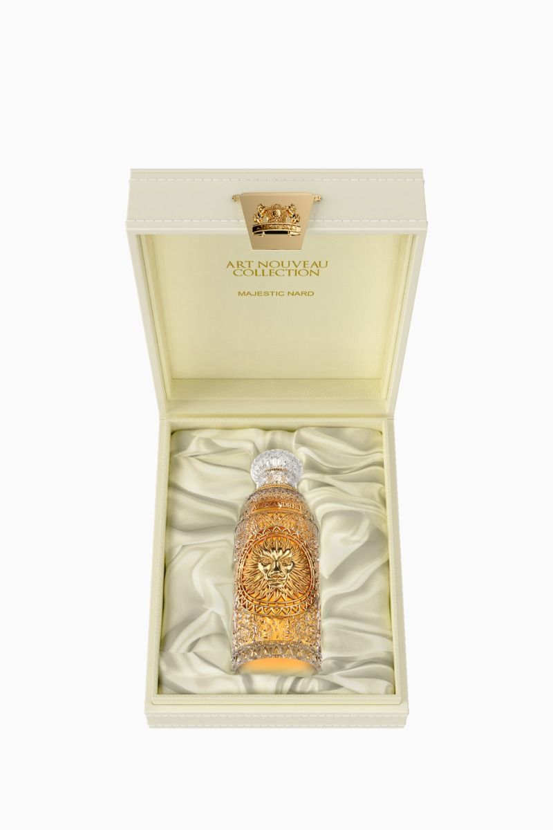 Travel in olfactive evocation inspired by the natural world of art and architecture. The opulent hand-blown bottles are made even more precious featuring patterns gilded with fine gold decadently packaged in lavish silk and leather... a nod to the period’s significant impact on design and decorative art. A seamless display of art’s most powerful symbol, this herald-worthy fragrance is a league of its own. Majestic Nard - fit for a king or queen, the opulent scent of undeniable power and ambition. WOODY & SPICY Top notes: Galbanum, Pink Pepper, Incense, Heart notes: Saffron, Jatamansi, Virginia Cedar, Sandalwood, Patchouli  ...