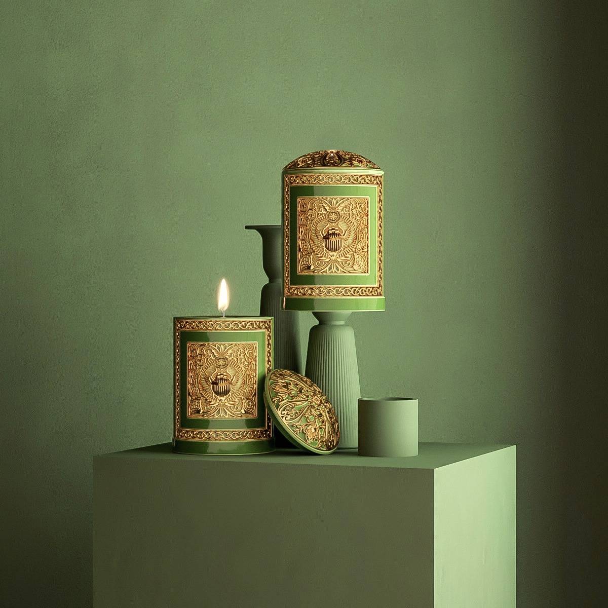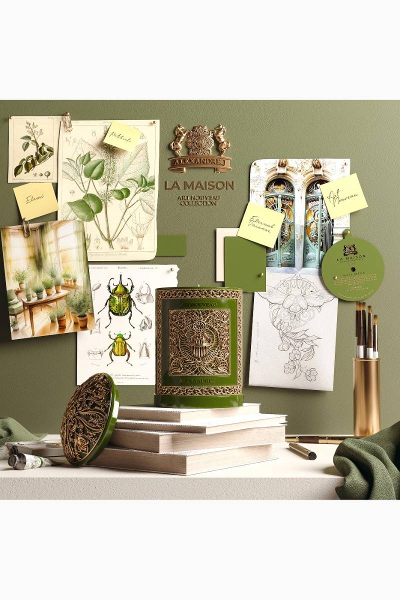 Alexandre.J's debut home fragrance collection, La Maison, offers a luxurious line of Italian-made candles that blend Art Nouveau-inspired packaging with distinctive, exceptional scents. The Pale Jade Candle and Holder Gift Set features the Eternal Incense candle, evoking the essence of opulent Eastern journeys. It fills any space with a warm, woody ambiance, bringing an air of mysticism and tranquility. A true objet d’art, this set adds both elegance and captivating ... fragrance to your home.