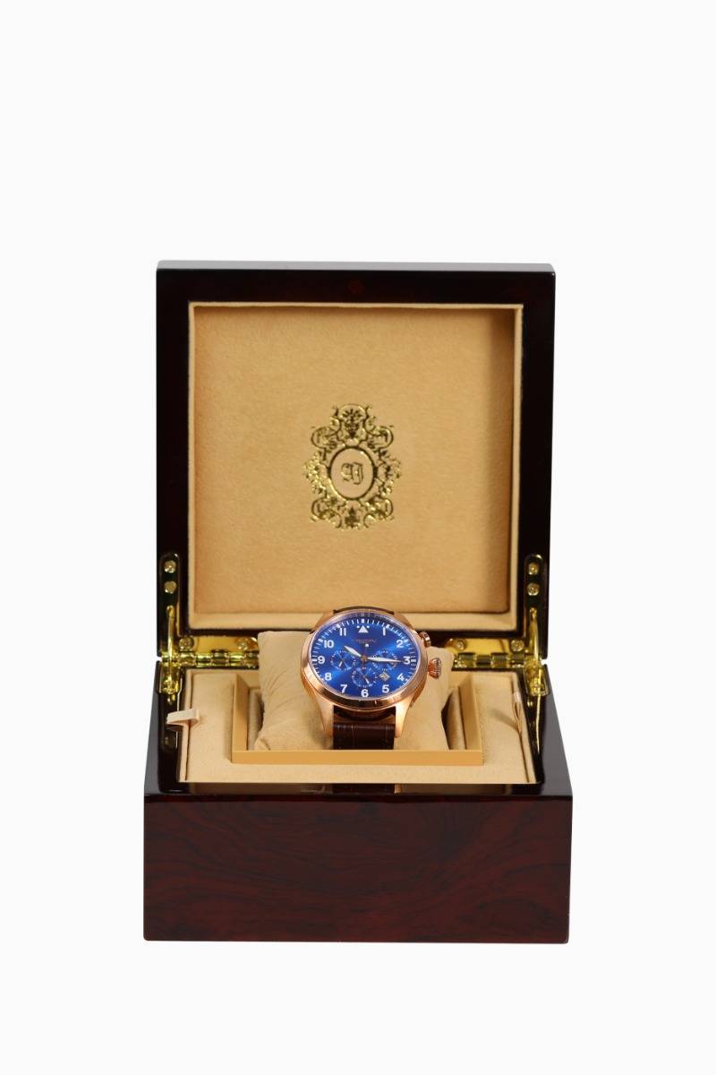 Elevate your collection with the Prestige Rose Gold Watch, a timepiece that blends classic aviation style with luxurious modern finishes. The watch features a substantial, polished rose gold-tone casing and complementing hardware, offering a warm and sophisticated contrast to the deep colors of the dial and strap. The striking vibrant blue sunburst dial instantly catches the eye and features large, highly legible white numerals in the classic pilot style. The ...