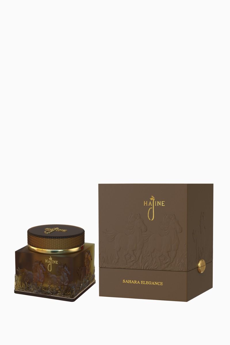 Packaging Elegance Encased in a matte, chocolate-brown presentation box, the packaging mirrors the jar’s horse motif with subtle embossing for a harmonious visual identity. The brand name Hajine and the product name Sahara Elegance are presented in gold foil, ensuring a refined, premium presence.