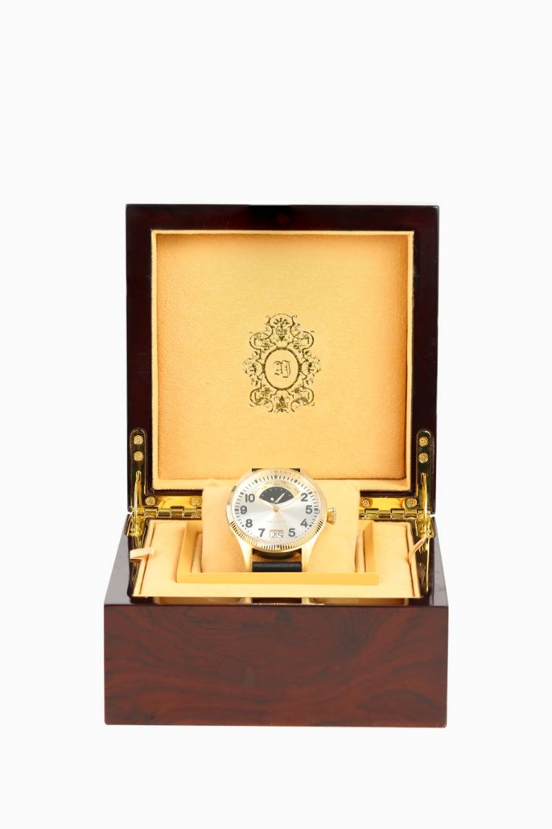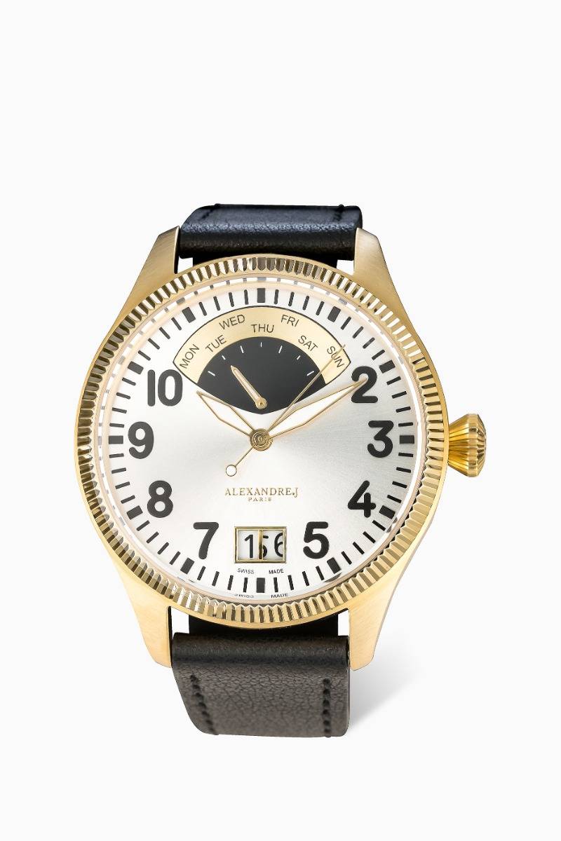 Created with a certain classicism, the SALIENT Gold watch is distinguished by the claw chiseling of the gold case and a dial with meticulous details. This quartz model has more complex specifications than a mechanical model. The date, day, and central seconds indicator appear beneath its sapphire crystal. EAN Code: 370 127 860 0233 Color: Gold Reference: AJ8032QG Material & Finishing: PVD 3N Strap: Leather Lens: Sapphire Glass Mechanism: Quartz ...